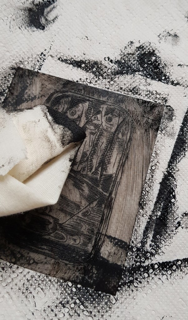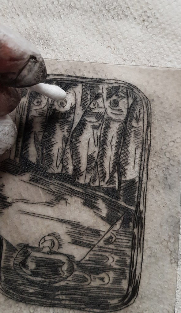 8. With circular movements rub the ink with your finger into the grooves and cover the whole plate.