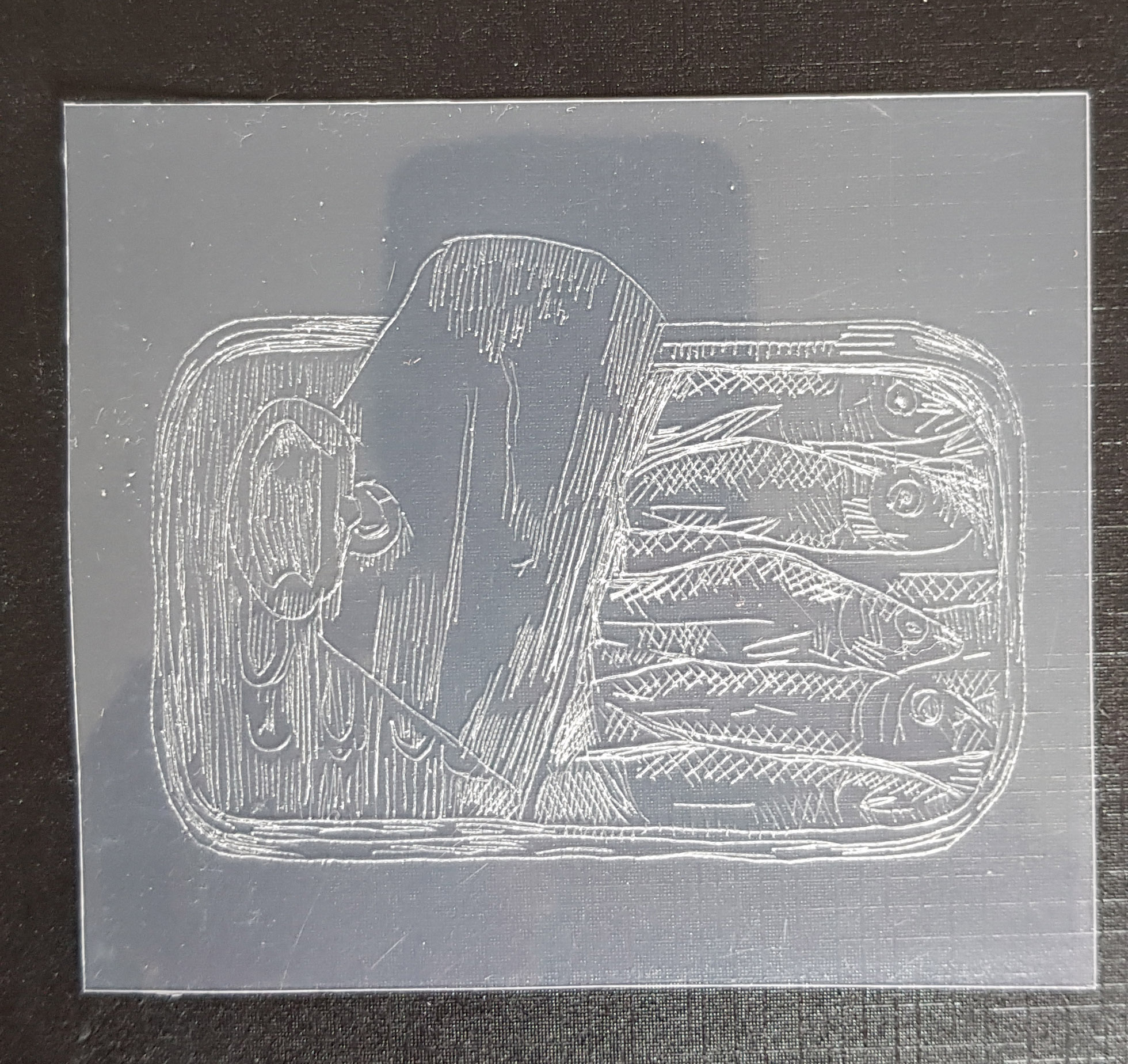 This printing process is called drypoint printing. Drypoint is a printing technique, where an image is engraved with a sharp point tool into a material such as metal or plastic. When the ink is rubbed over the engraved lines, the ink lies in the grooves of these lines while the rest is rubbed away.
