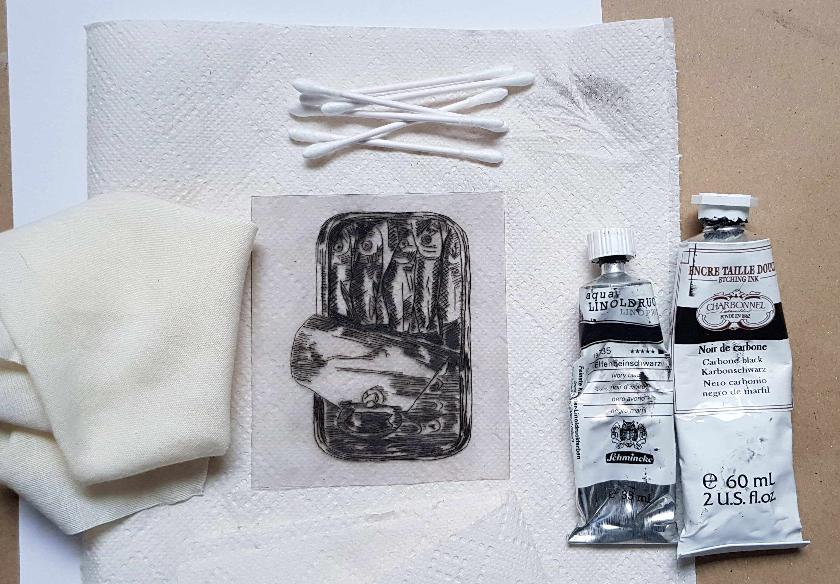 9. With the cloth, rub all the excess ink from the plate. Lastly with light movements and kitchen towel, wipe the plate on both sides clean.